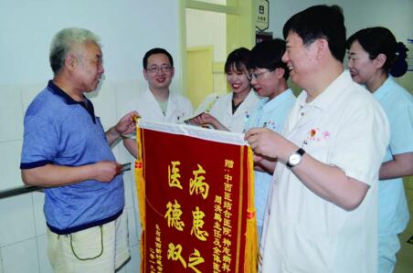 6月24日上午,尹大爷将一面写有“病患之家 医德双馨”的锦旗送到神志病科医护人员手中,并现场将自己手写的一封表扬信读给大家,表达了对神志病科医护人员的感谢之意。