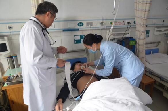 当日上午10:09分,内分泌科14床患者突发急性胸痛,医护人员第一时间为患者吸氧,并做12导联心电图、抽血化验肌钙蛋白。心电图结果显示高度怀疑心梗,速请心内科医生急会诊。不到5分钟,心内科医生到达内分泌科病房,根据“病情”判断患者急需PCI手术。在与家属沟通交流后,确定施行急诊PCI手术。随即紧急启动导管室,4分钟后导管室人员、药物、设备全部就位。经过紧急术前准备,内分泌科医护人员将患者送到导管室进行相关手术治疗。