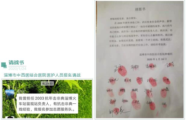 倡议发出后,淄博市中西医结合医院紧急动员,全院医护人员积极响应,主动请战。“我报名!”“全科待命!”“我参加过抗击非典我先上!”……一句句坚定而有力的回响萦绕在这个不一样的除夕夜。这些请战人员中,有从事临床一线的医生、护士、技师、药师,也有从事行政、后勤的工作人员。